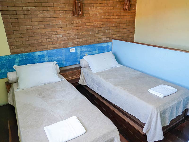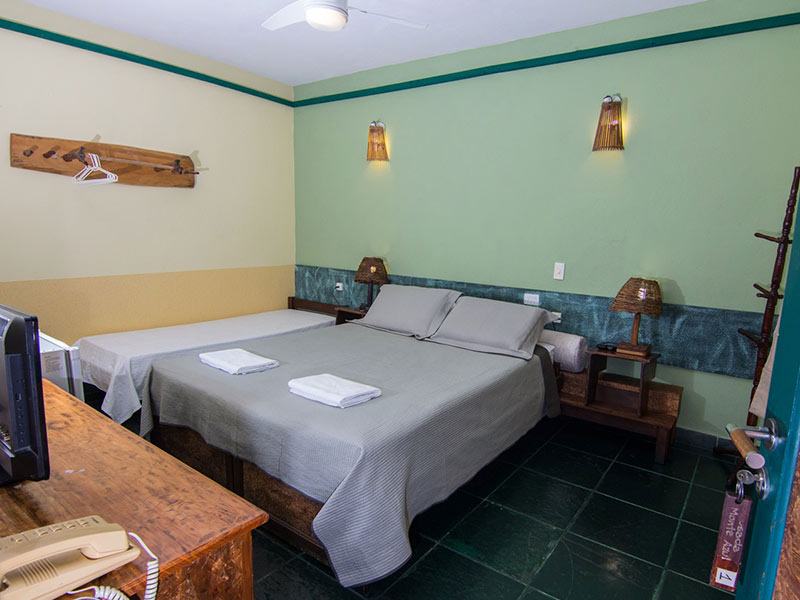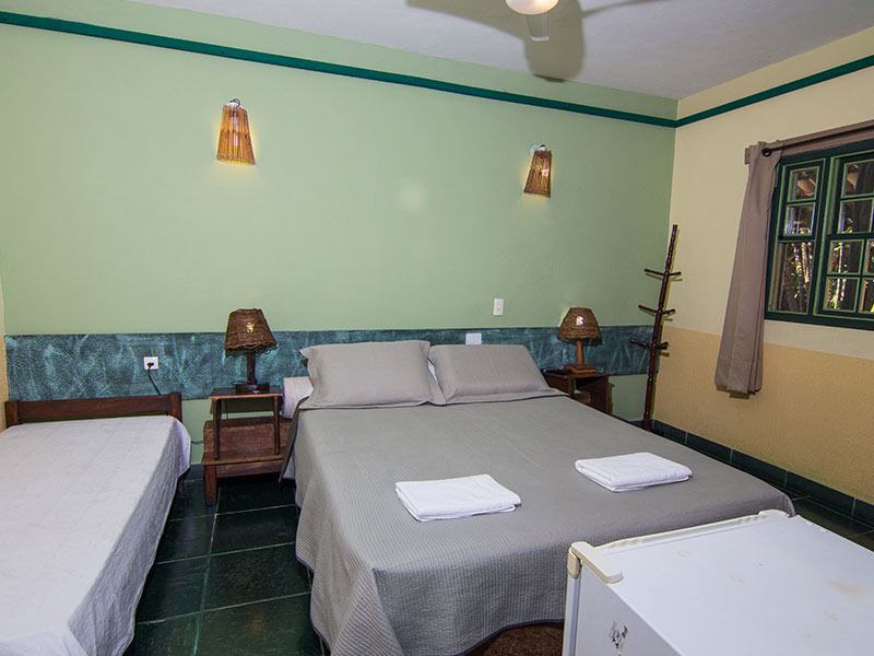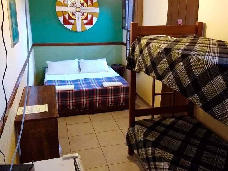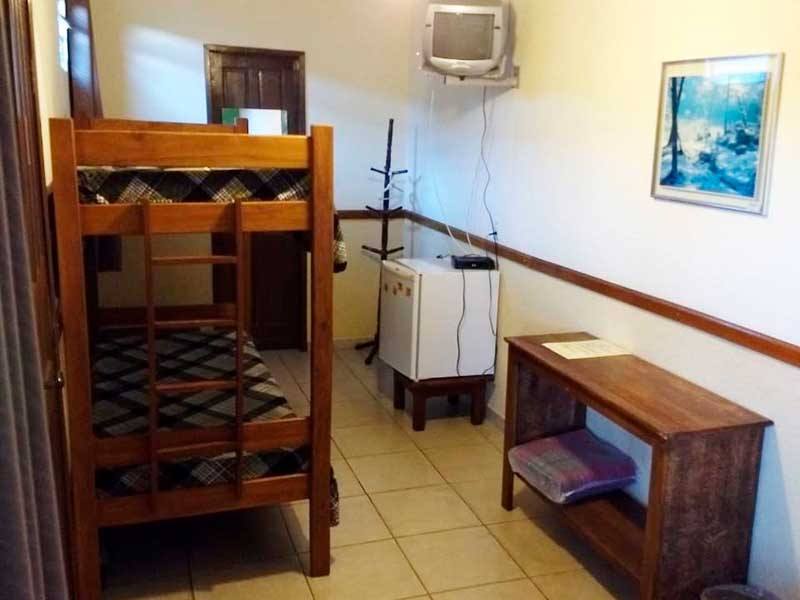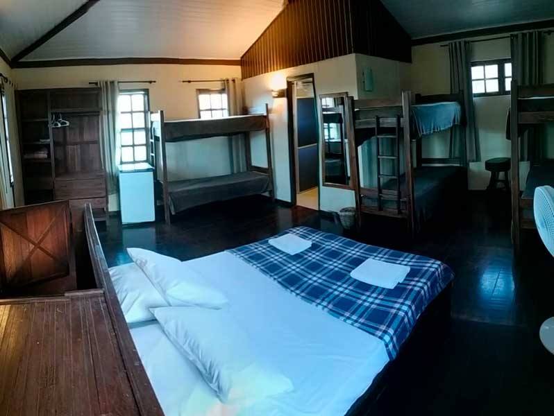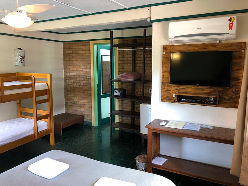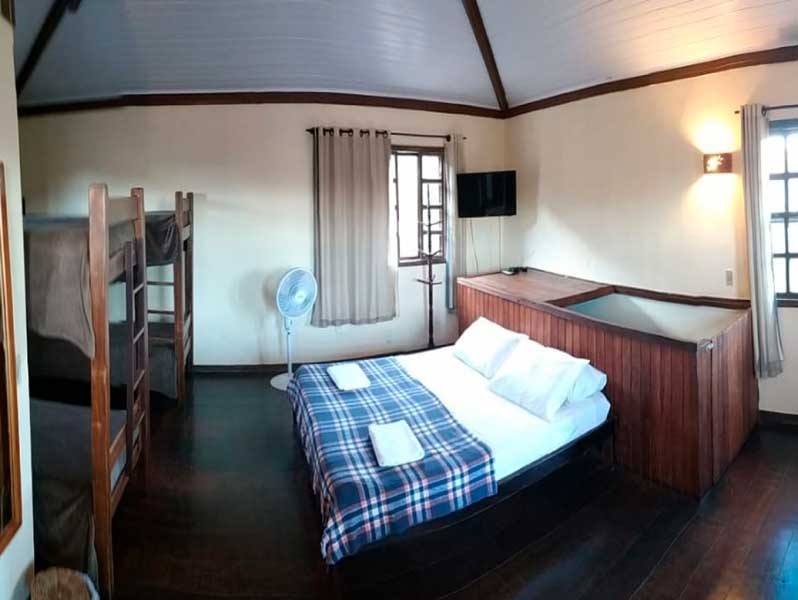 A suíte grupo na Pousada Monte Azul comporta até 8 pessoas, sendo uma cama de casal, 3 beliches, todas as camas em um mesmo ambiente espaçoso, ideal para grupos, possui banheiro privativo, frigobar, tv tela plana , ventilador de piso e guarda-roupas.