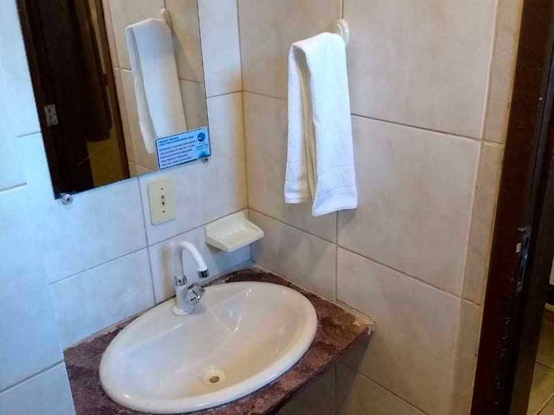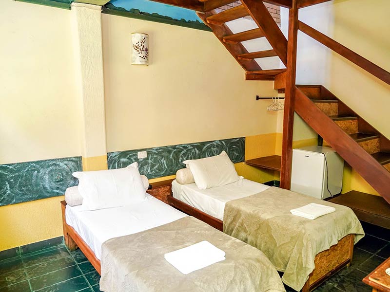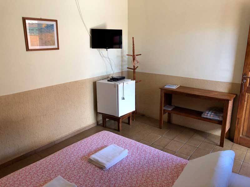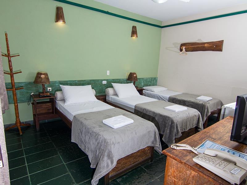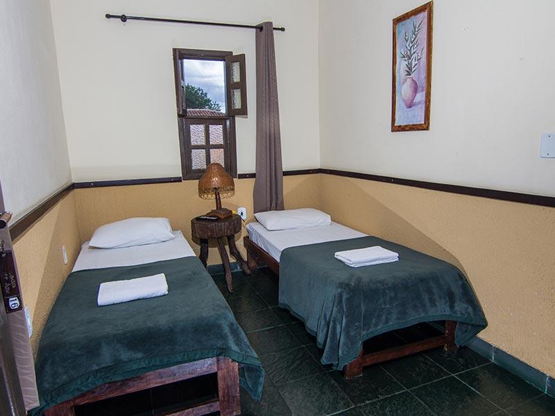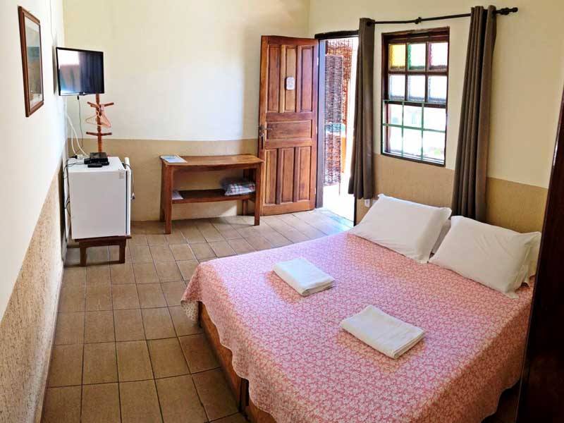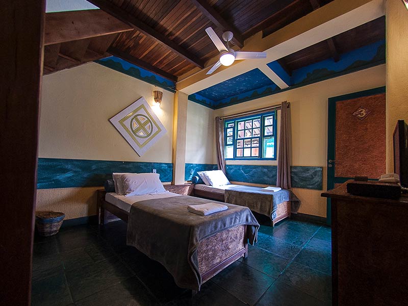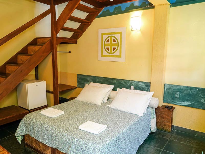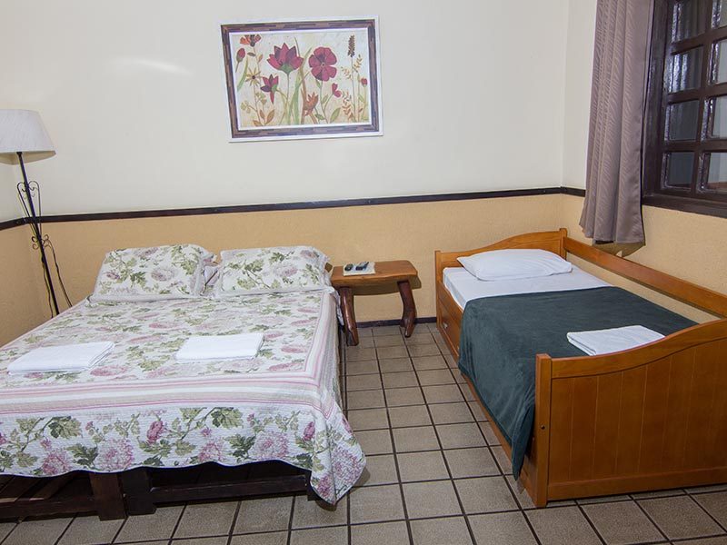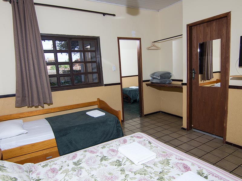 As Suíte Grupo da Pousada Monte Azul, localizada no 1º andar, possuem TV, frigobar e uma decoração rústica.